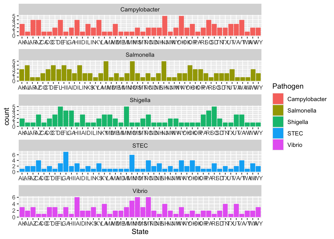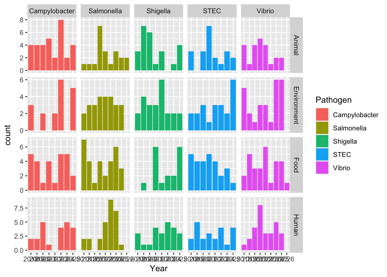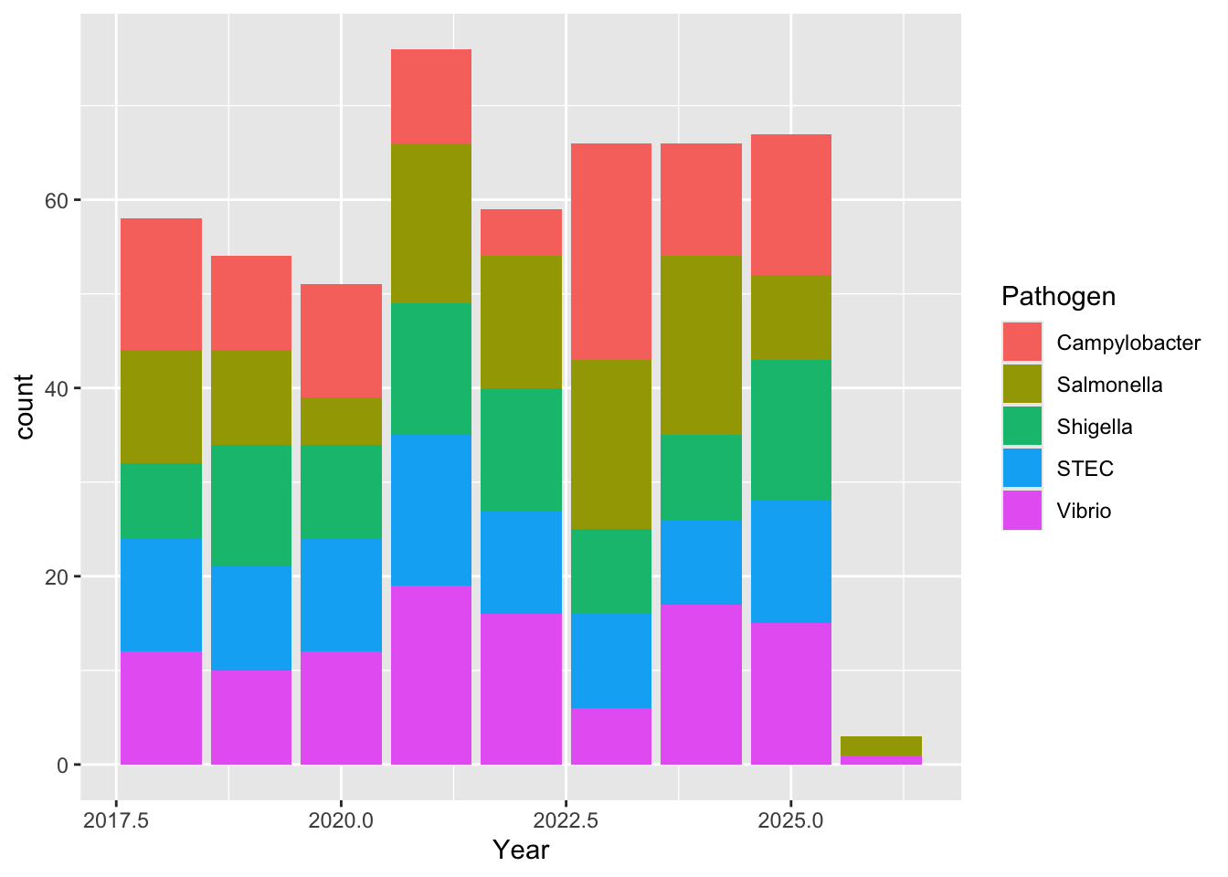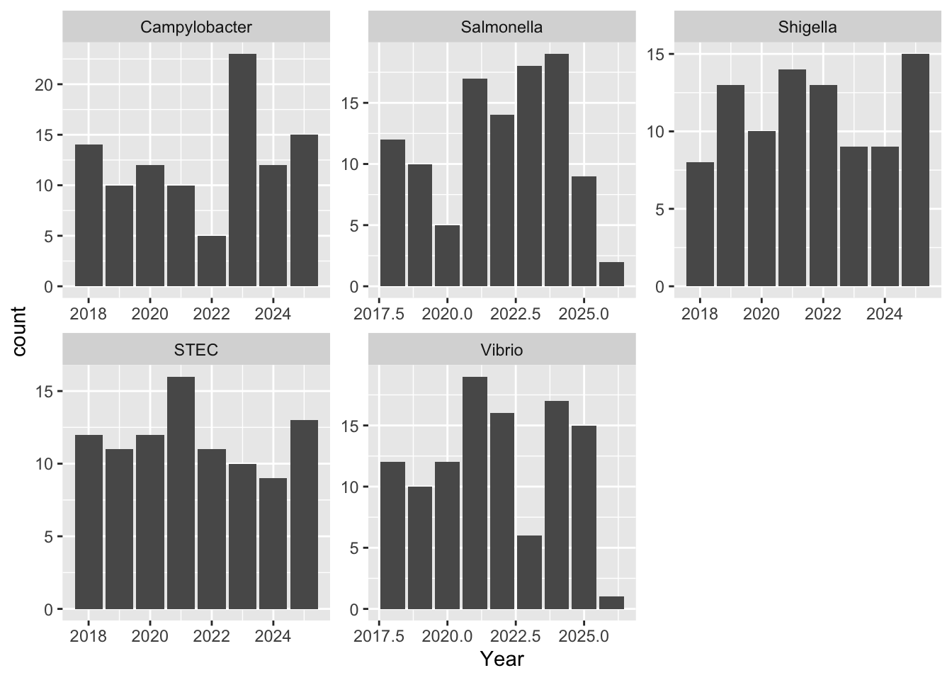 syn_data$Pathogen <- sample(c("Campylobacter", "STEC", "Salmonella", "Shigella", "Vibrio"), n_obs, replace = TRUE)