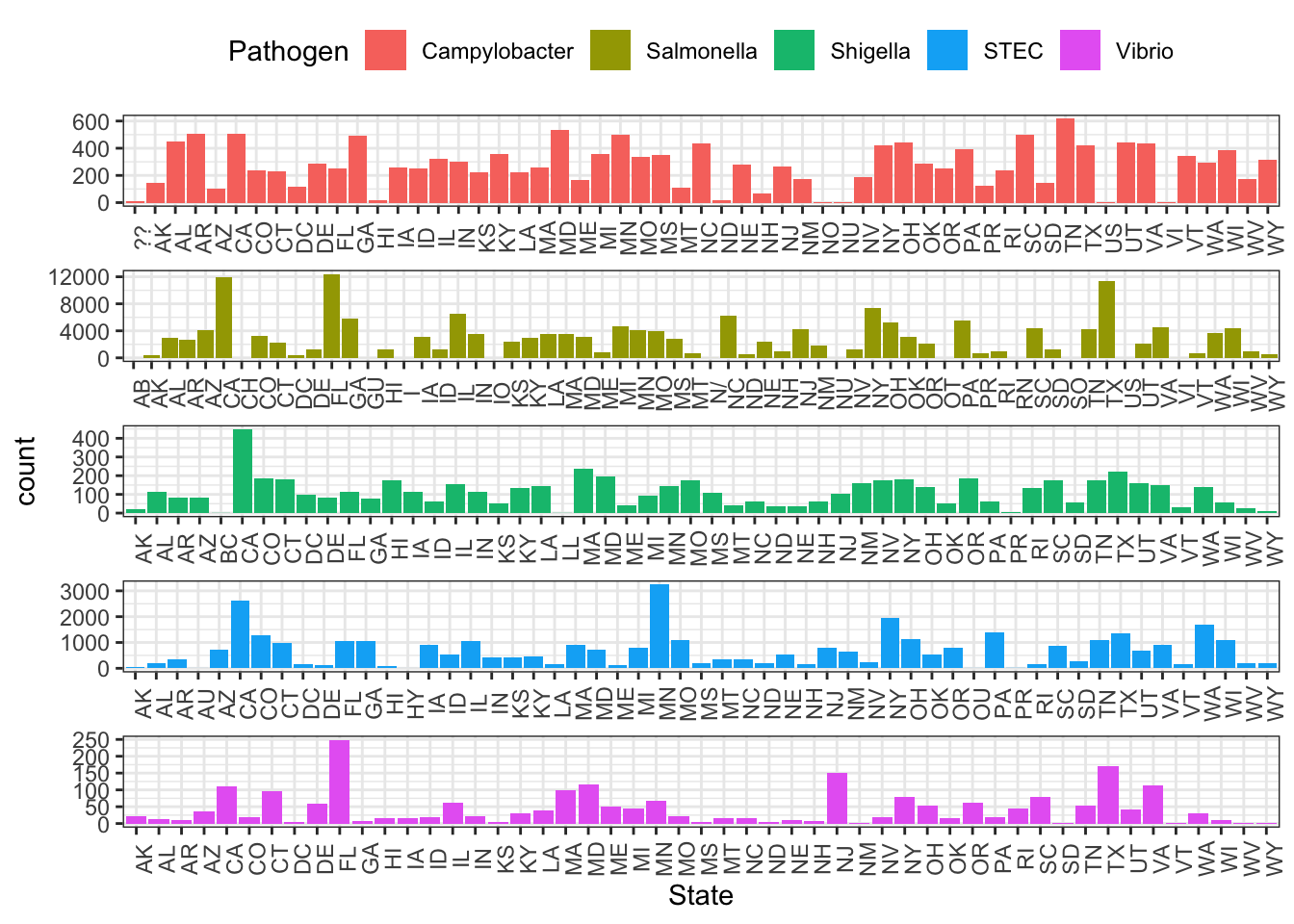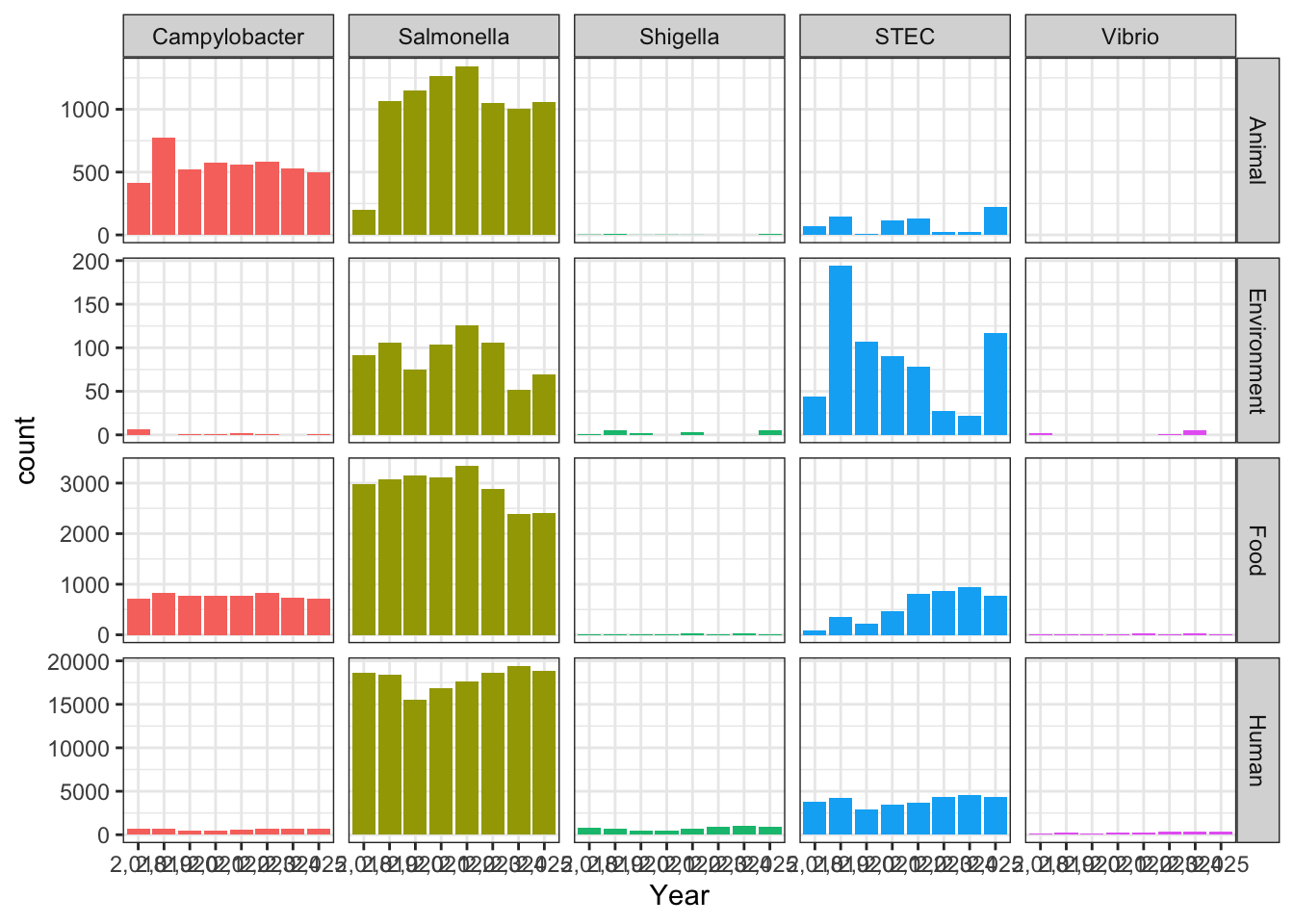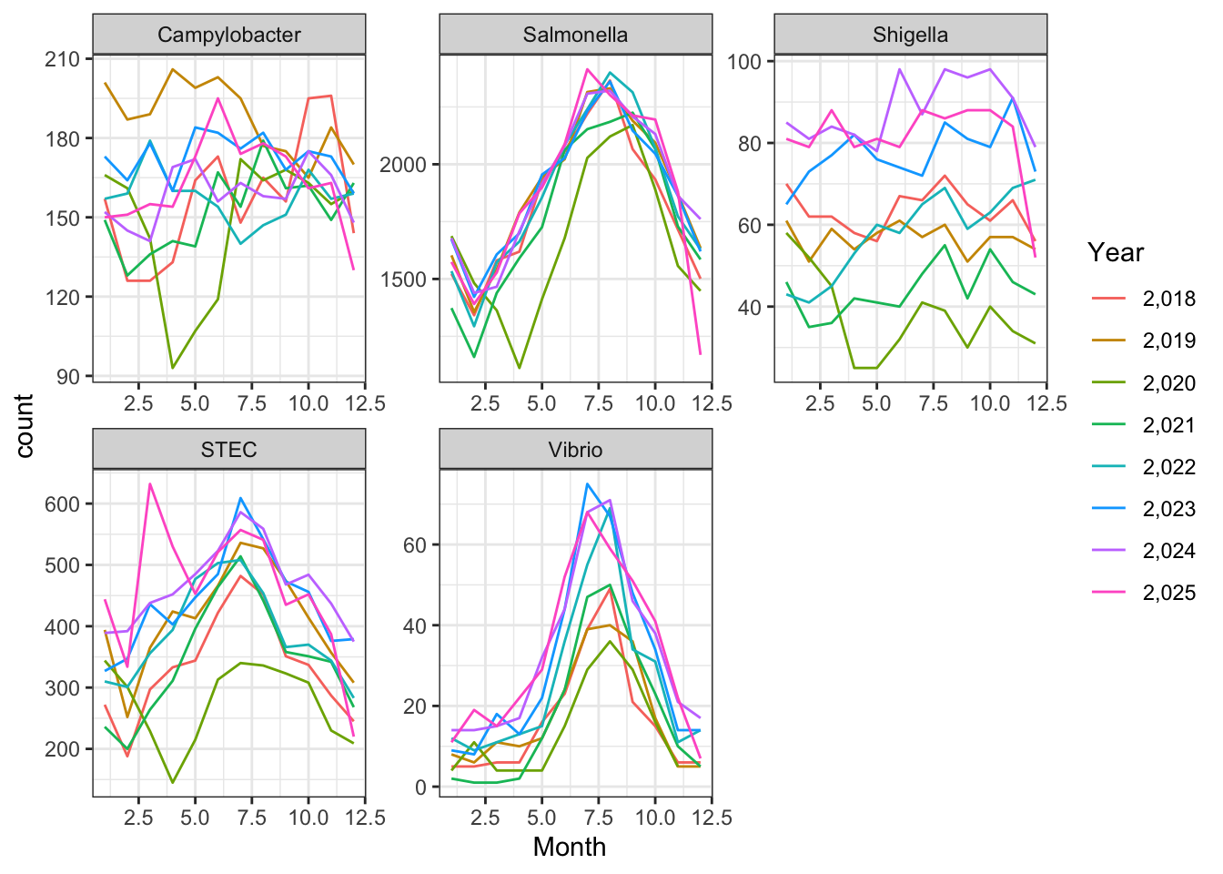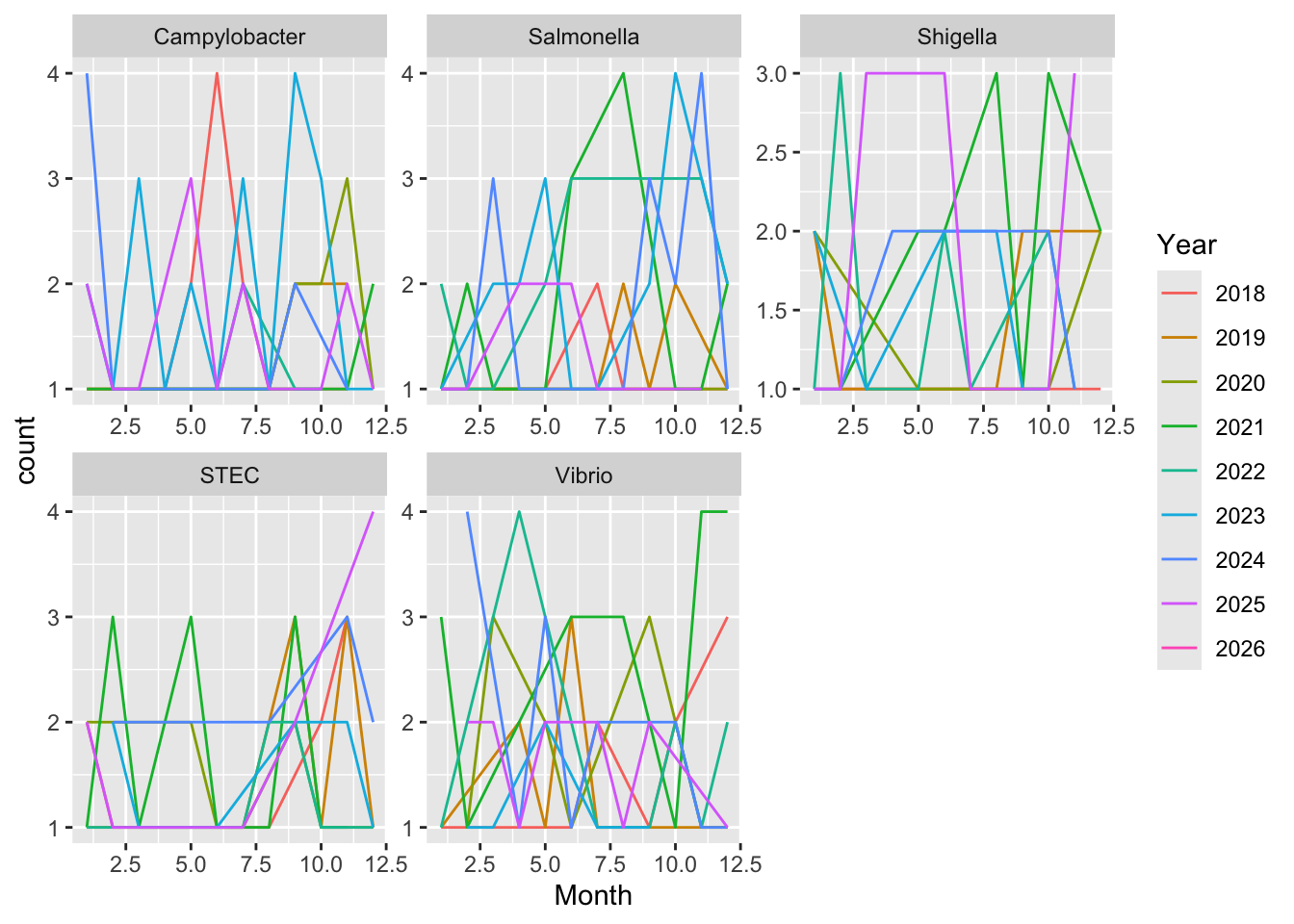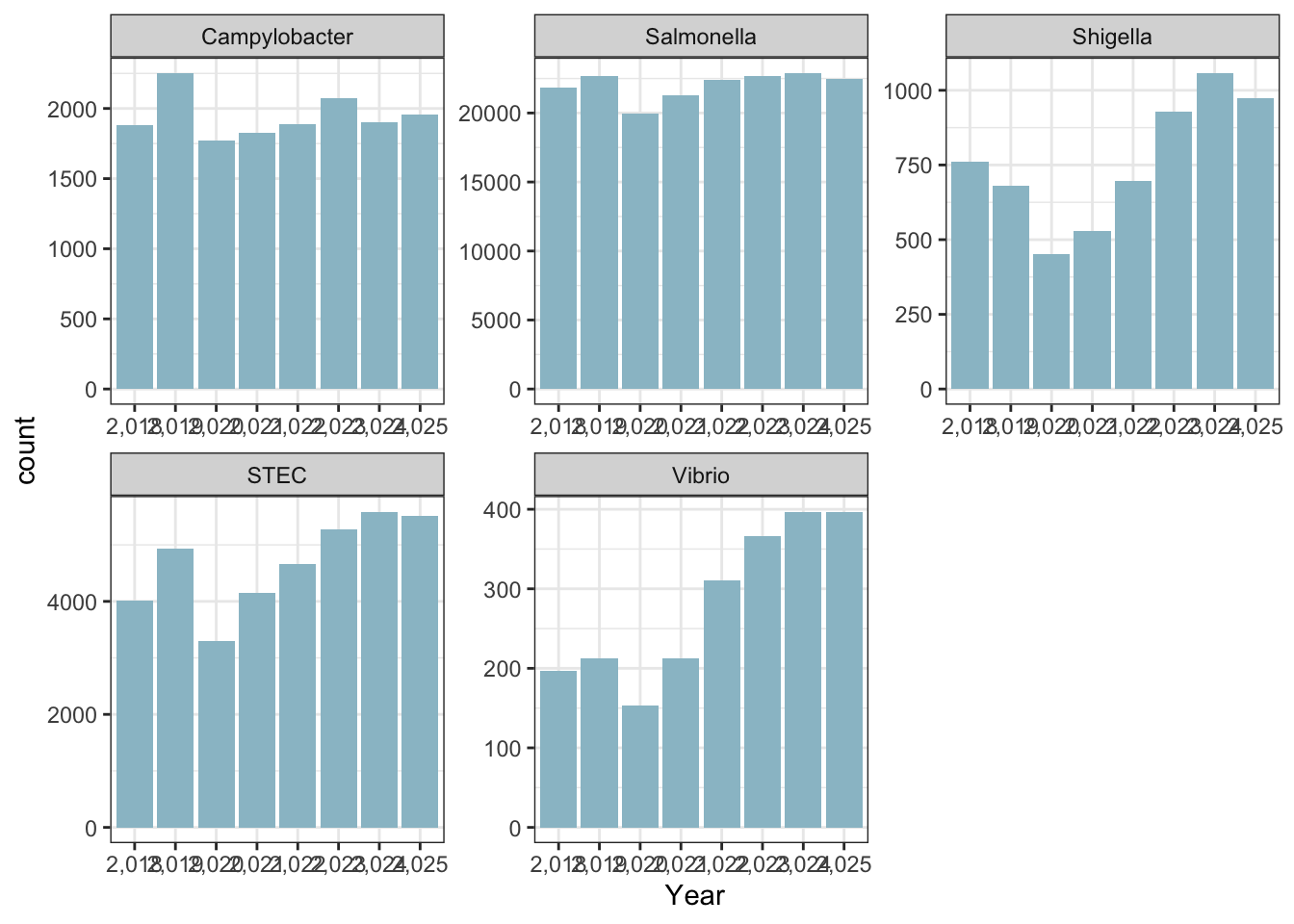 syn_data$Pathogen <- sample(c("Campylobacter", "STEC", "Salmonella", "Shigella", "Vibrio"), n_obs, replace = TRUE)