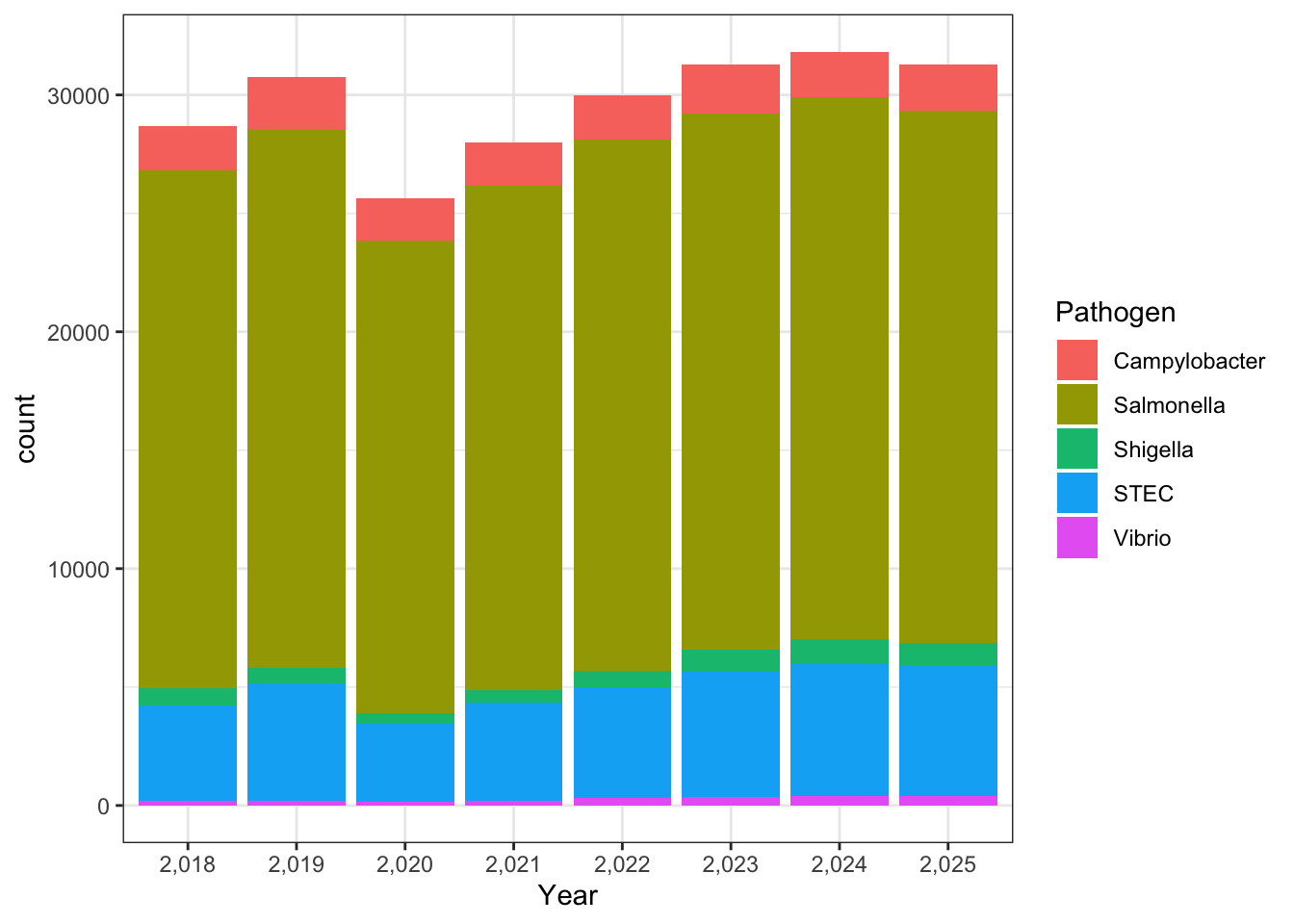 unique(cdcdata_2$Pathogen)[1] "Campylobacter" "STEC" "Salmonella" "Shigella"